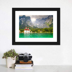 This striking canvas captures the serene beauty of Lake Konigssee, featuring emerald green waters and a dramatic cloudy sky. A charming red-domed church adds a remarkable touch to the landscape, creating a majestic and awe-inspiring atmosphere.