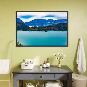 This serene canvas art captures the beauty of Lake Kremasta in Greece, featuring a peaceful lake surrounded by layered mountain ranges and a small island. The realistic portrayal in soft blues and greens evokes a natural, vast atmosphere perfect for bringing a touch of the outdoors into your home.