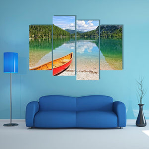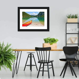 A red canoe rests at the edge of a calm mountain lake, with pine forest and distant peaks reflected in the water. The image follows a rule-of-thirds composition and uses a palette of red, green, blue, white, and brown to create a serene, peaceful mood. It makes understated room decor for a modern living space or bedroom.