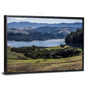 A panoramic nature photograph of water, rolling hills, trees, and coastline that conveys a peaceful, serene, and vast mood. Layered landforms and light on the rolling hills create depth and contrasting textures between foliage and water. Works well in living rooms, home offices, or modern spaces that favor landscape imagery.