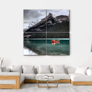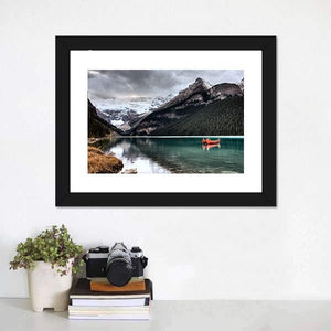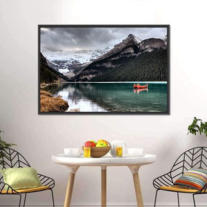 Experience the serenity of Lake Louise with this captivating canvas wall art. The scene features majestic snow-capped mountains, a vibrant orange canoe, and calm waters reflecting the overcast sky, creating a tranquil atmosphere ideal for any nature lover.