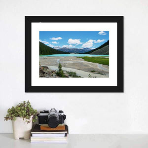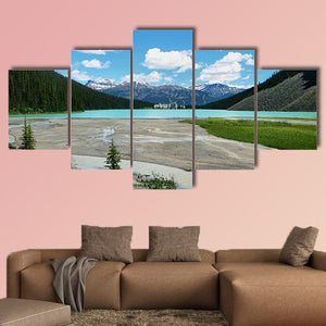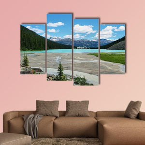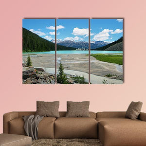 Lake in Banff National Park features a turquoise lake framed by a pine forest, rocky shore, and snow-capped mountains, composed with clear depth and rule-of-thirds balance. Rendered as nature photography in blue, green, white, and brown tones, the scene feels serene and grand and suits modern or nature-inspired rooms.
