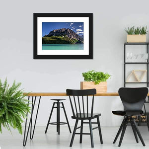 Lake Louise, Alberta shows a wide-angle mountain and turquoise lake scene backed by a dense pine forest. Snow patches on the peaks and a blue sky with clouds add natural contrast and scale. The piece’s serene, majestic mood suits modern living rooms and entryways.