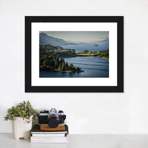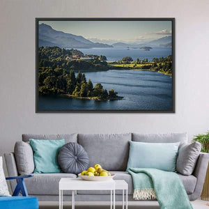 This canvas art beautifully captures Lake Nahuel Huapi, surrounded by a serene landscape of mountains and trees. The tranquil palette of blue, green, and grey evokes a picturesque summer day, perfect for adding a calming touch to your wall decor.
