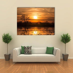 This serene landscape captures a bare tree silhouetted against a stunning sunset over a calm lake. The warm palette of orange, yellow, and dark blue creates a tranquil atmosphere, perfect for enhancing your home with a touch of nature.