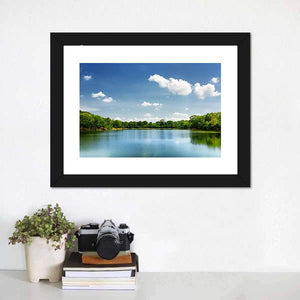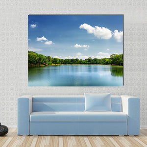 This canvas wall art features a tranquil lake surrounded by lush green trees under a serene sky filled with clouds. The calming palette of blue and green invites a sense of peace, making it a perfect addition to any nature-inspired decor.