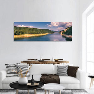 Lake Oasa in Romania presents a panoramic, photo-realistic view of a calm blue lake winding through a lush green forest valley beneath dramatic clouds. The scene feels serene and vast and works well in modern rooms or nature-inspired spaces as a quiet focal point.