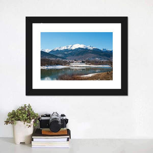 This serene landscape features a tranquil lake surrounded by majestic snow-capped mountains and a quaint village. The peaceful palette of blues, whites, and browns captures the essence of winter in Greece, making it a perfect addition to any nature-inspired decor.