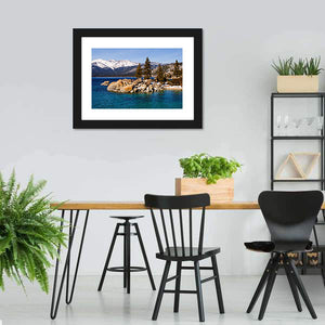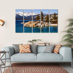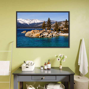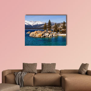 This landscape artwork captures Lake Tahoe in winter, featuring rocky islands, snow-capped mountains, and pine trees. The serene scene, painted in rich blues and greens, reflects the majestic beauty of nature, enhanced by sunlight glinting off the clear blue lake.