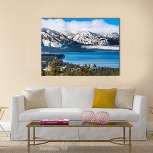 This canvas art captures the serene beauty of Lake Tahoe, framed by majestic, snow-capped Sierra Mountains. The tranquil blue lake and towering pine trees create a calming atmosphere, making it a beautiful addition to your nature-themed decor.