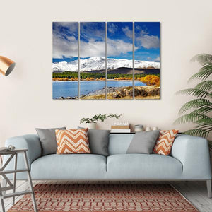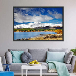 This artwork beautifully captures the serene landscape of Lake Tekapo in New Zealand, showcasing snow-capped mountains, a peaceful lake, and autumnal trees under a partially cloudy sky. Its photorealistic style invites a calming ambiance, making it a perfect addition to any nature-inspired décor.