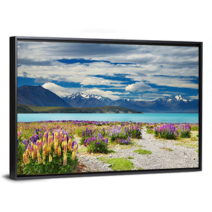 This canvas wall art captures the serene beauty of Lake Tekapo in New Zealand, featuring vibrant lupine flowers amidst turquoise waters and snow-capped mountains. The photorealistic scene invites a tranquil atmosphere into your space.