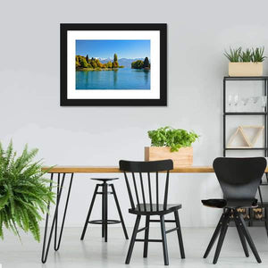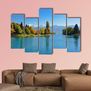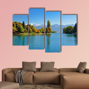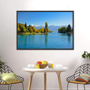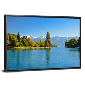 Lake Thun In Autumn Canvas Wall Art captures a tranquil lakeshore framed by fall foliage and snow-capped mountains beneath a clear blue sky. The realistic landscape, in blue, green, white and brown tones, brings a peaceful, serene mood to home living spaces and modern interiors.