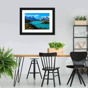 This captivating canvas art features serene lakes surrounded by majestic mountains, showcasing a turquoise body of water and a long bridge leading to a small white building on an island. Its realistic style invites a sense of peace, making it a beautiful addition to any nature-inspired decor.
