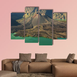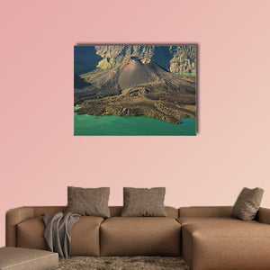 Aerial nature photography of a volcanic cone rising from a crater lake in Indonesia, captured with a wide-angle, top-down perspective. Muted browns, greens, greys and black create a dramatic, awe‑inspiring atmosphere. Suited to modern or nature-themed rooms as a bold wall focal point.