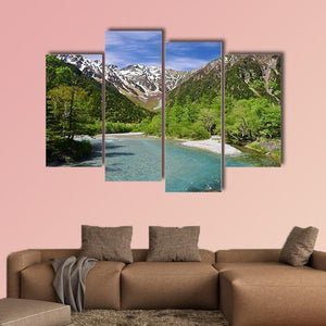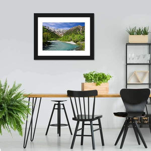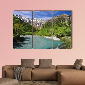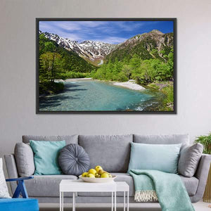 Kamikochi Highland Japan Canvas Wall Art captures a wide-angle mountain landscape with snow-capped peaks, a clear blue river, and lush green trees. Rendered realistically in blues, greens, whites, and greys, it gives a calm, majestic feel that suits nature-focused or modern rooms.