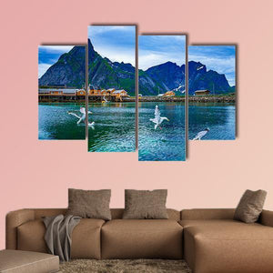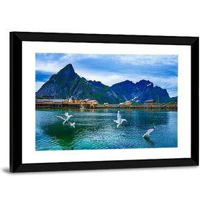 A photorealistic view of a Norwegian lake framed by mountains and a small wooden village, with birds in flight over calm water. Rendered in blues and greens, the scene feels serene and majestic and suits modern or nature-inspired room decor.
