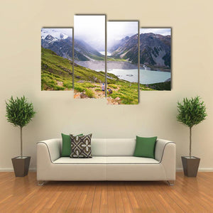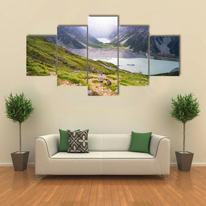 This realistic landscape print features a glacial lake framed by snow-capped mountains and green hills, with two hikers adding scale and a human touch. The green, blue, gray, and white palette gives a serene, adventurous mood that fits modern home decor.