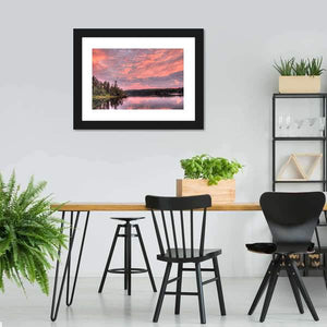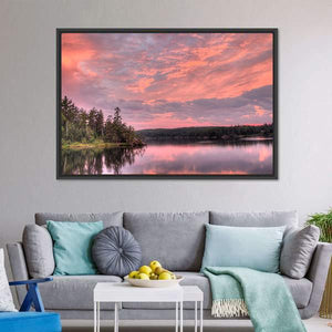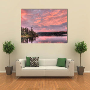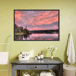 A lakeside landscape framed by national forest, trees and clouds under a pink-and-orange sky with a clear reflection in the water. The rule-of-thirds composition and palette of pink, orange, green and brown create a serene yet dramatic mood, well suited to nature-focused or modern room decor.