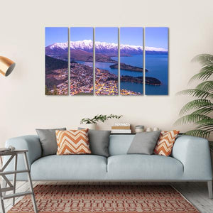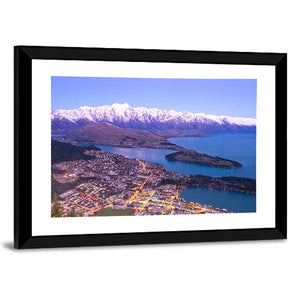 This canvas wall art features a stunning aerial view of the serene lakes and snow-capped mountains surrounding a quaint town in New Zealand. The vibrant palette of blue, white, green, and yellow captures the tranquility of nature, making it an ideal addition to any home.