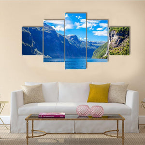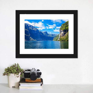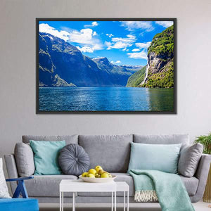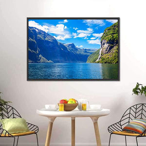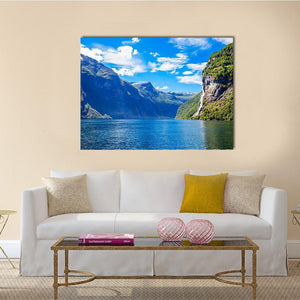 Lake With Seven Sisters Waterfall Canvas captures fjords, mountains and a cascading waterfall beside a calm lake, presented in a wide-angle, panoramic view. The blue, green, white and gray palette gives a majestic, serene feeling. Works well in modern homes as a nature-focused wall piece for living rooms or entryways.