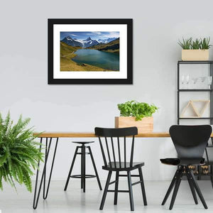 This landscape artwork captures a tranquil mountain lake surrounded by snow-capped peaks and grassy hills. The serene scene features a winding path along the shimmering water, evoking a sense of majesty and calm that complements any nature-inspired décor.