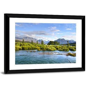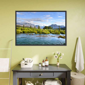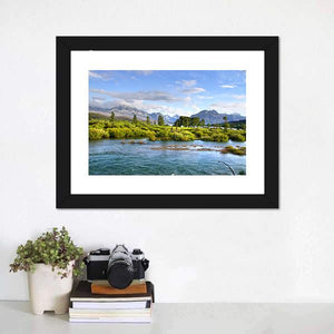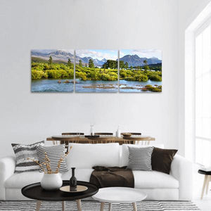 This panoramic print captures a lake at Glacier National Park with mountains, a rocky riverbed, trees, and a clear sky. Its wide, serene scene of blues, greens, grey, and white brings a calm, natural mood that suits modern or nature-themed room decor.