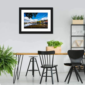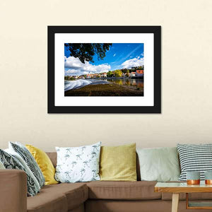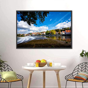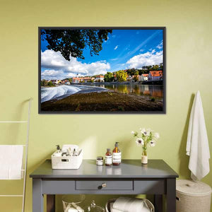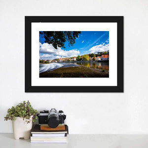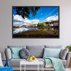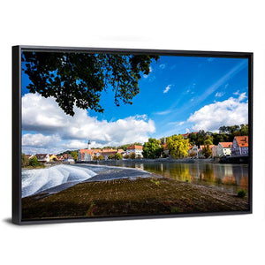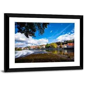 Landsberg Am Lech In Autumn shows a realistic riverside town scene with trees in autumn tones, red-roofed buildings, and water cascading over a dam under white clouds. The wide-angle, rule-of-thirds composition feels serene yet vibrant and picturesque. Suited as wall decor in modern or nature-focused living spaces.