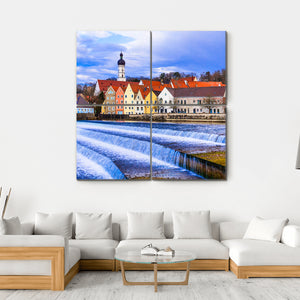 This canvas artwork features a picturesque scene of a cascading river waterfall leading to a charming town in Germany, complete with a prominent church steeple. The vibrant palette of blues, whites, and yellows captures a serene atmosphere that will enhance any room.
