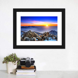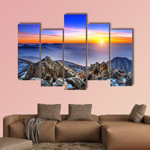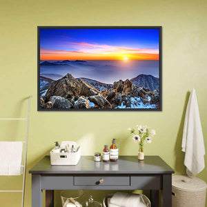 Deogyusan National Park Canvas Wall Art captures a serene winter sunrise over layered mountain peaks dusted with snow and a rocky foreground. Soft blues, pale pinks and warm orange around the low sun, with streaky clouds, create a peaceful, majestic scene that suits modern, nature-inspired interiors.