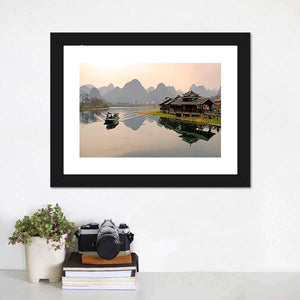 Landscape In Yangshuo shows a tranquil riverside scene with misty mountains, a small boat, and traditional architecture reflected in calm water. Soft blues, greens, browns, grays and a touch of pale orange give it a serene, picturesque mood that suits modern or nature-inspired room decor.