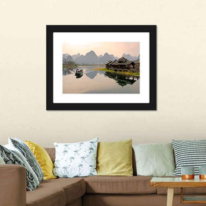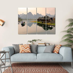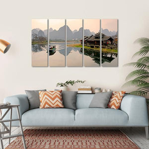 This canvas art vividly captures the serene beauty of Yangshuo, showcasing a picturesque scene with calm waters, karst mountains, and traditional Chinese architecture. The soft palette of blue, green, brown, and pink invites tranquility into any space.