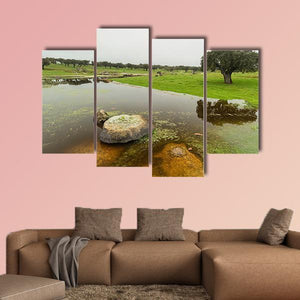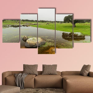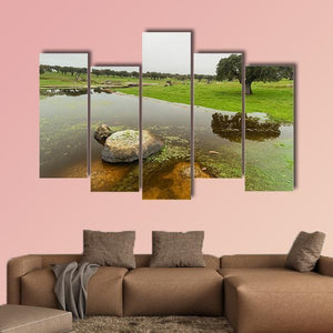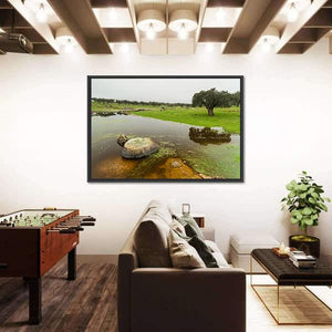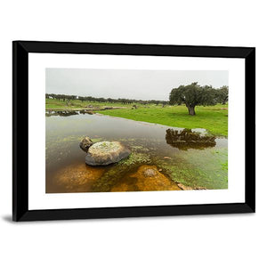 Pond in Extremadura, Spain captures a quiet pond and marshy grassland with rocks, a large boulder in the foreground and a single tree on the right. Muted greens, browns and grays with an overcast sky give the scene a calm, rustic feel that works well in nature-inspired or rustic rooms.