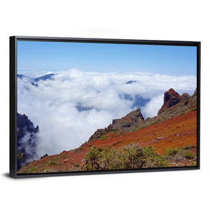 A photorealistic canvas shows a mountain range beneath a bright blue sky, with rocky terrain, sparse vegetation, and drifting clouds along Hiking Trail GR131. The composition uses the rule of thirds to create a majestic, serene, awe-inspiring mood. It suits modern homes and rooms that favor natural landscape wall art.