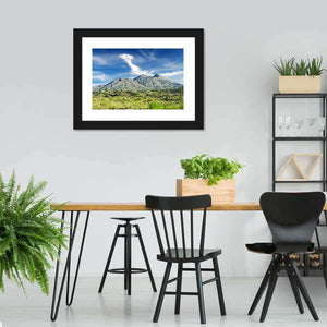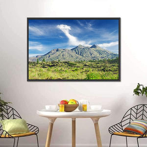 This canvas art depicts the majestic Batur Volcano surrounded by serene mountains and a vivid blue sky. The natural elements create a vast and peaceful atmosphere, making it a beautiful addition to any wall.