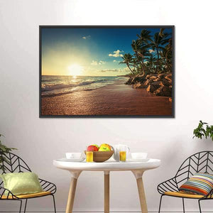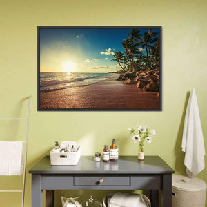 This canvas art captures a serene beach scene at sunset, featuring palm trees and waves gently crashing on the shore. The calming palette of blue, orange, and brown brings a tranquil atmosphere to any space.