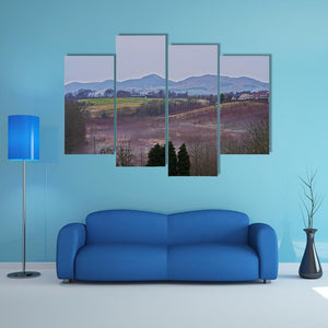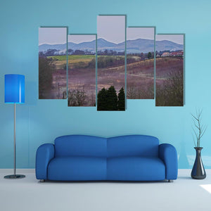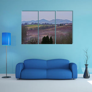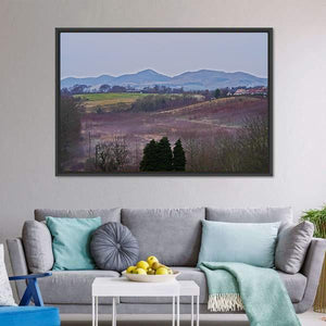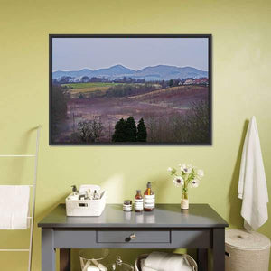 This landscape canvas captures rolling hills, distant mountains, and serene fields. Rendered in calm greens, browns, and blues, it creates a tranquil atmosphere perfect for any room.