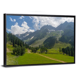 Sonamarg, Jammu Kashmir Canvas Wall Art shows a wide, high-angle landscape of mountains, a tree-lined valley and a dirt road leading toward snow-capped peaks beneath puffy white clouds. The realistic print uses greens, blues, white, brown and grey to convey a serene, majestic, and vast atmosphere. A calm choice for living room or study wall decor.