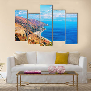 Landscape Of Taormina presents a high-angle view of Taormina’s coastal town, with white buildings along cliffs above the blue sea. Rendered in a realistic style with blues, browns, greens and whites, the daytime scene feels serene and vibrant under scattered clouds. It works well in living rooms, entryways, or rooms with coastal decor.