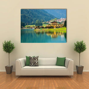 A serene lakeside landscape showing mountains, trees, and a yellow‑faced building reflected in calm water. Rendered realistically in blue, green, yellow and white tones, this print suits nature-inspired home decor and calming interiors.