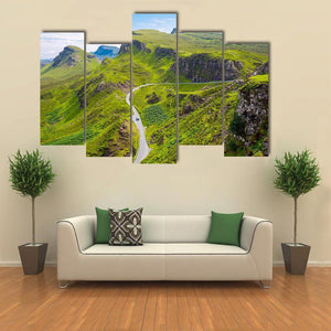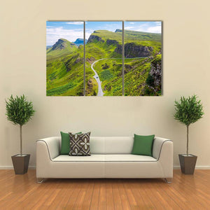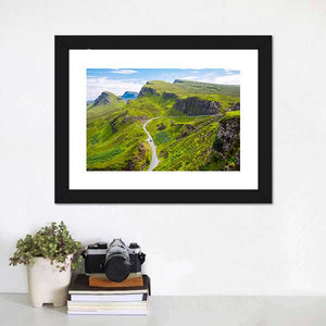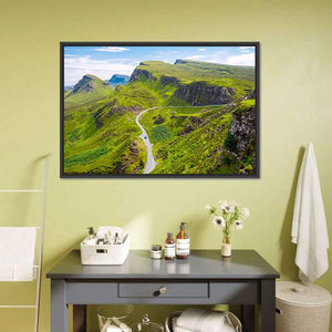 This canvas art captures a high-angle view of a winding mountain road nestled among green hills under a serene sky. The realistic, photorealistic style evokes a sense of adventure and tranquility, making it ideal for any nature-inspired room.