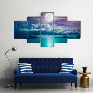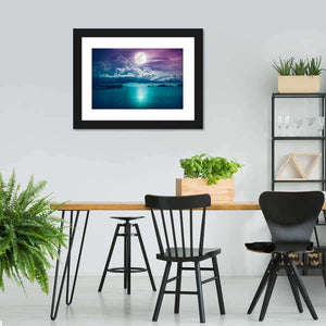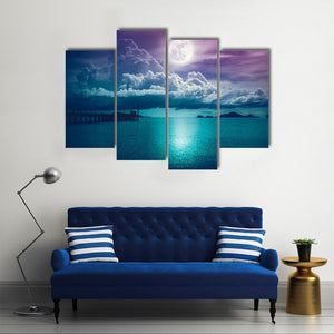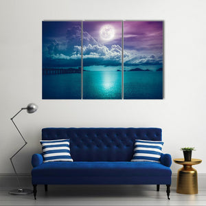 A moonlit seascape featuring a glowing moon, reflective water, a pier and distant islands in blue and purple tones. The modern composition — guided by the rule of thirds — creates a serene, mystical mood that fits well in modern living rooms or bedrooms.