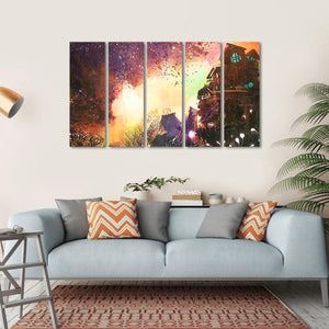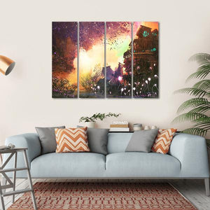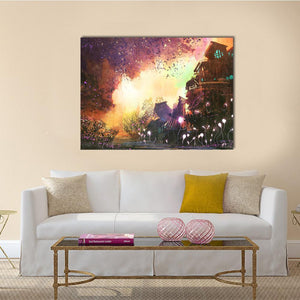 This captivating piece features a surreal landscape with an ancient tower, glowing plants, and birds in flight. The vibrant palette of purples, oranges, and greens creates a magical and dreamlike atmosphere, enhancing any art collection with its mysterious charm.
