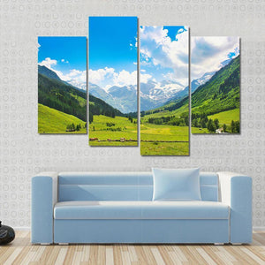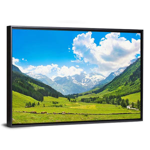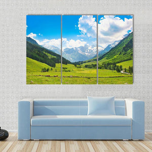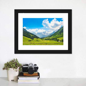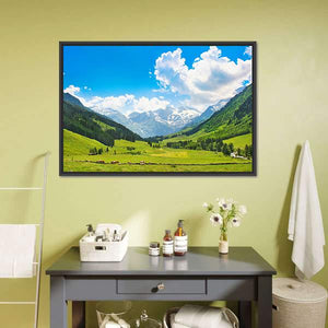 This landscape artwork captures the serene beauty of the Austrian Alps. Featuring lush green fields, majestic mountains, and a peaceful valley under a bright blue sky, it's perfect for bringing a touch of nature into your home.