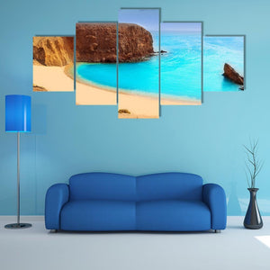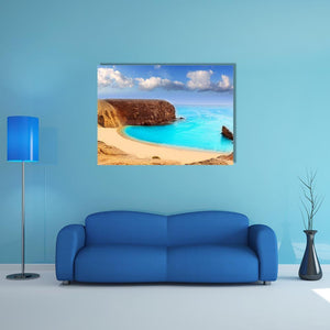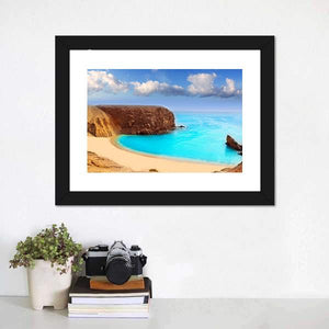 Capture the serenity of Lanzarote's coastline with this stunning canvas wall art. Featuring a vibrant beach scene, textured cliffs, and fluffy clouds, this piece brings the beauty of nature into your home.
