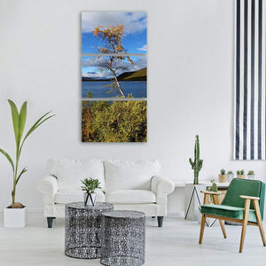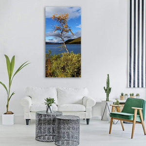 A realistic landscape showing a slanted tree by a calm lake, rolling hills and clouds in an autumn sky. The blue, green and yellow palette creates a serene, natural, peaceful mood. Suits living rooms or nature-inspired spaces looking for understated wall art.