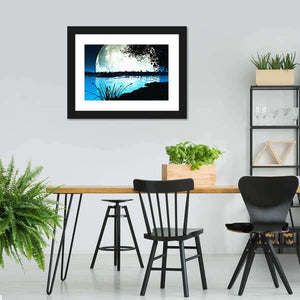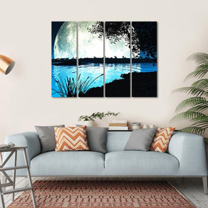 This canvas artwork features a serene moonlit landscape with a tranquil night sky, highlighted by a large moon over a reflective lake. The atmospheric palette of blue, black, and grey evokes a mystical vibe, perfect for enhancing any modern room decor.
