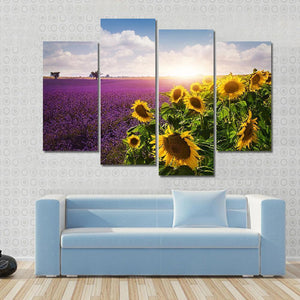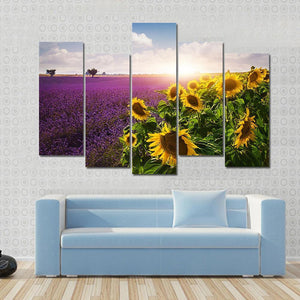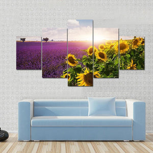 This canvas showcases vibrant sunflowers in the foreground set against a serene lavender field and dramatic clouds above. The peaceful color palette of purple, yellow, and blue brings a refreshing atmosphere to your space.