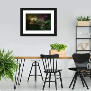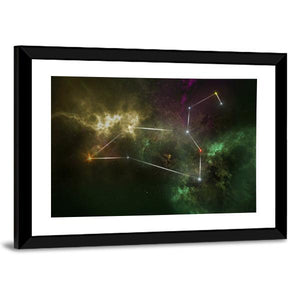 Leo Constellation Canvas Wall Art shows the Leo constellation, stars, and a nebula with glowing lines connecting the stars in green, yellow, purple, white, and orange tones. The abstract, modern piece gives a cosmic, ethereal feeling and works well in contemporary living rooms or bedrooms as wall decor.