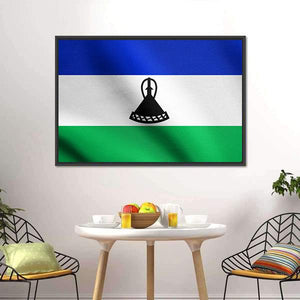 This canvas features the national flag of Lesotho rendered in a bold, graphic style with a patriotic feel. The symmetrical composition and a palette of blue, white, black and green create a colorful focal point suited to contemporary and modern rooms.